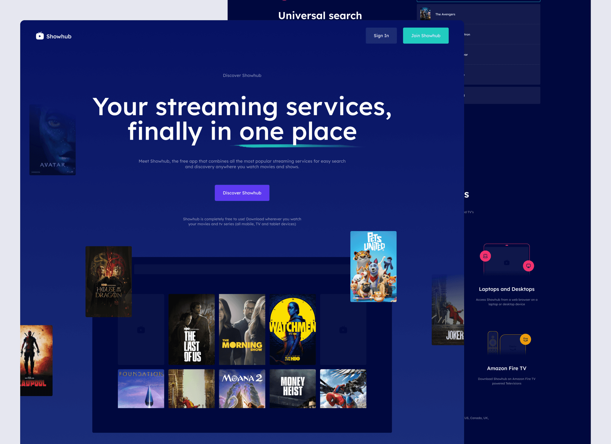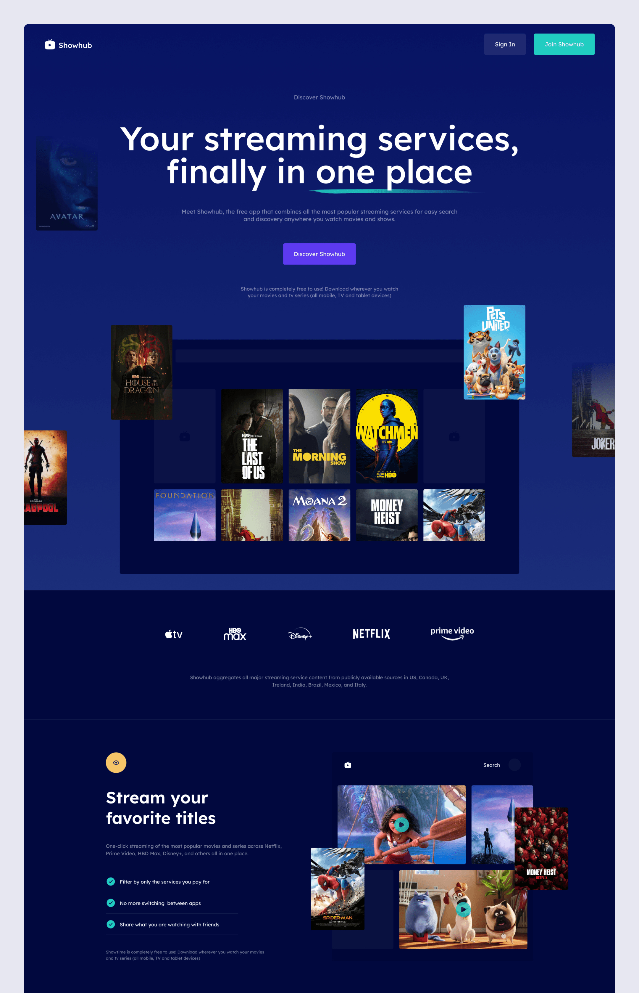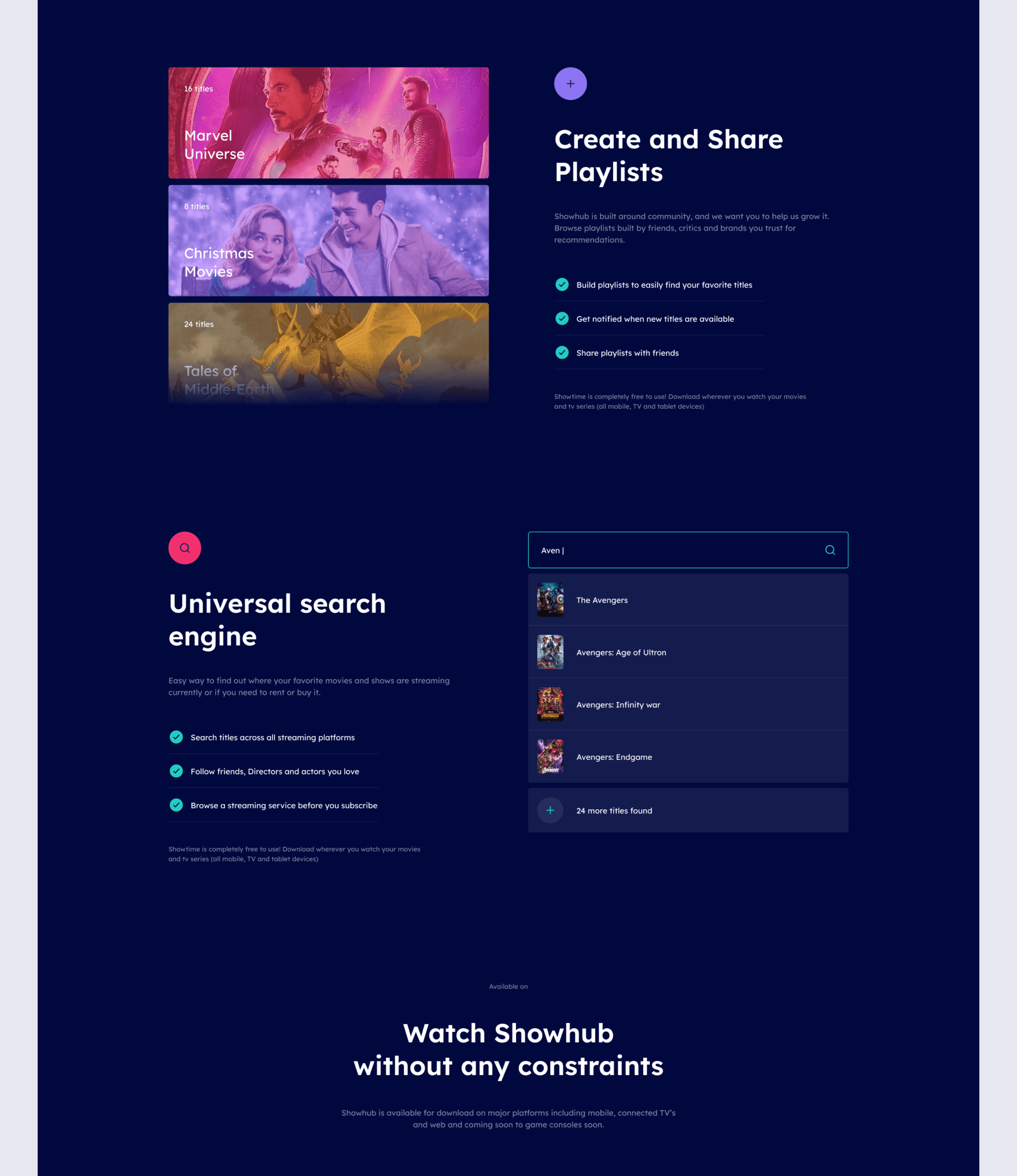 Showhub, Streaming services in one place, Build playlists of movies, shows and episodes across all popular streaming services.